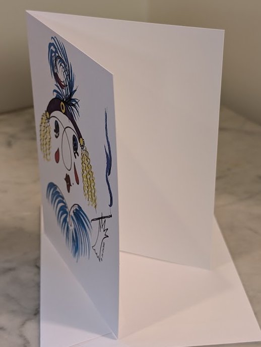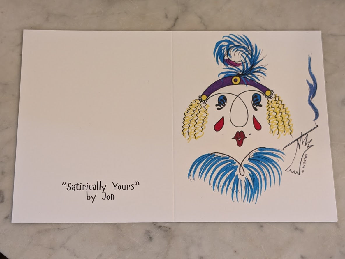Printed on heavy weight Matte paper; the cartoon drawing on the front, a blank interior of the card allows for your personalized message, and the back of the card features the "Satirically Yours" by Jon logo. An envelope is also included.