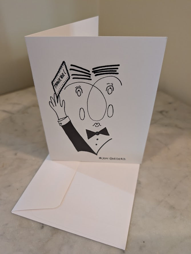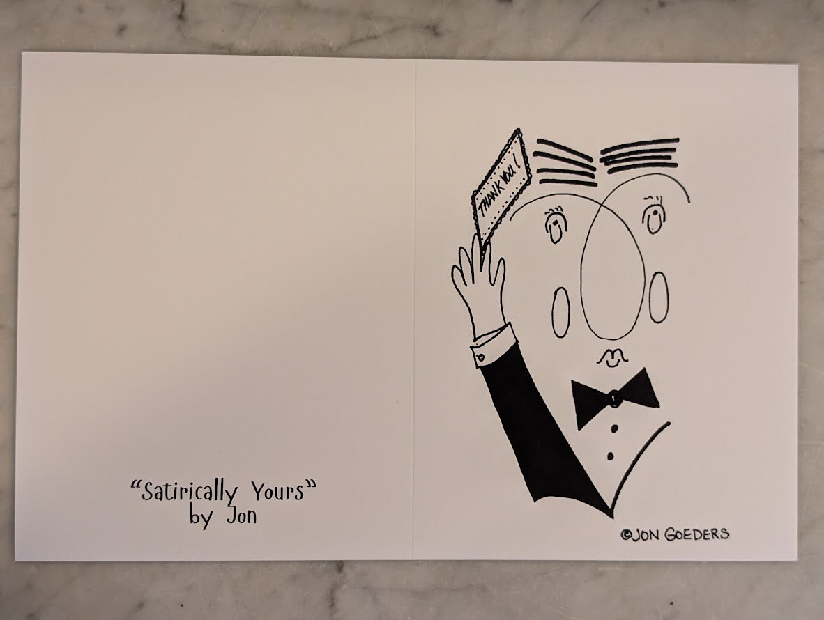 Printed on heavy weight Matte paper; the cartoon drawing on the front, a blank interior of the card allows for your personalized message, and the back of the card features the "Satirically Yours" by Jon logo. An envelope is also included.