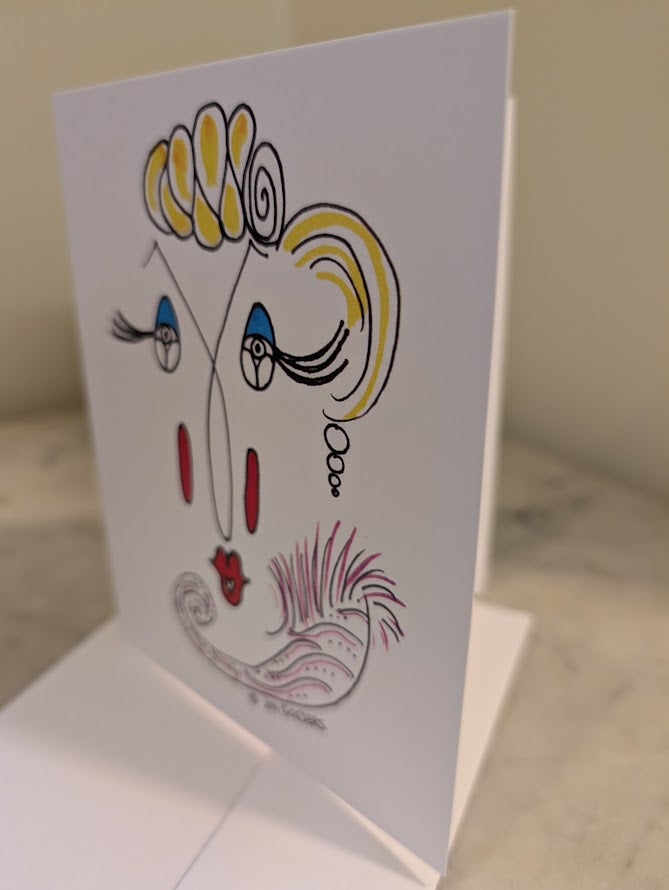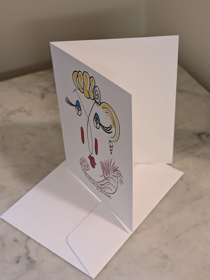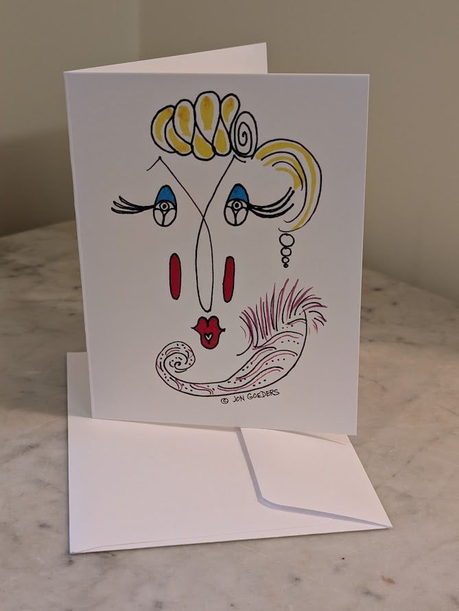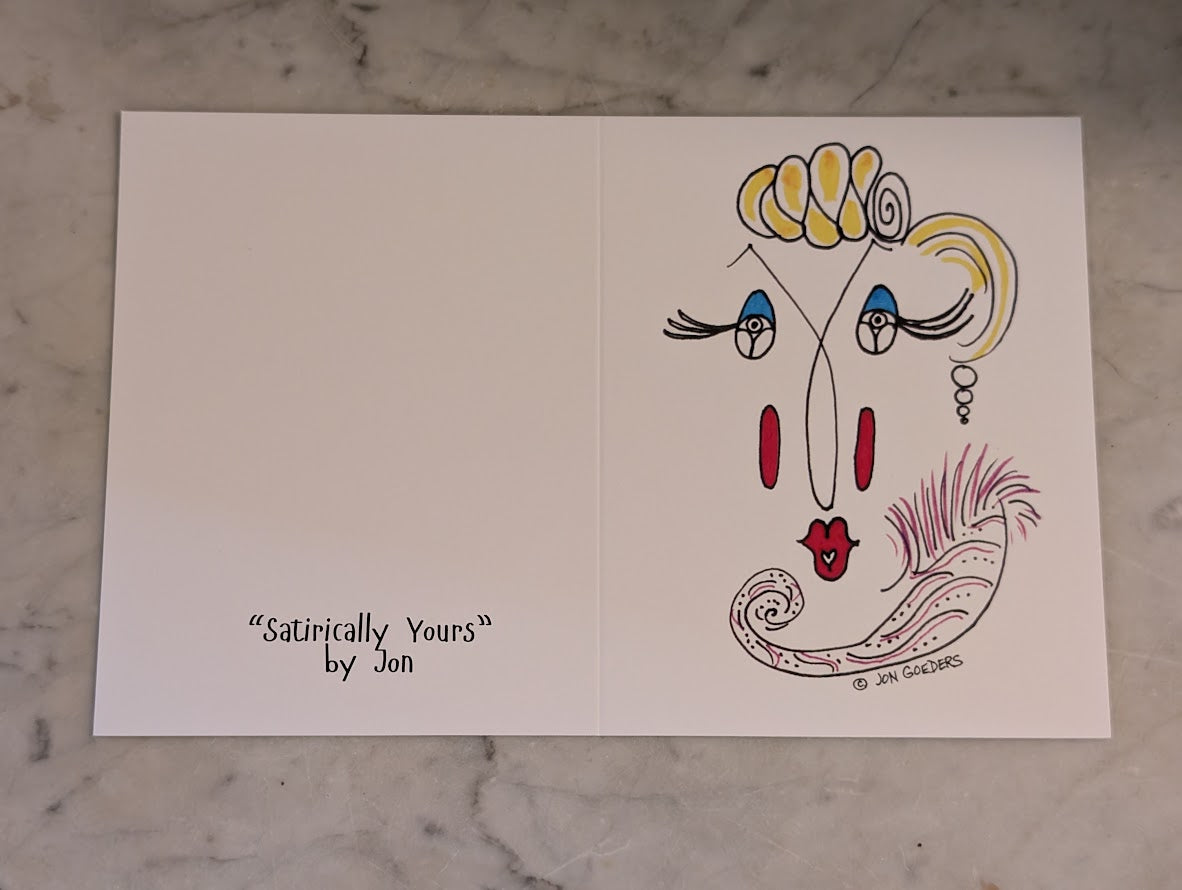 Printed on heavy weight Matte paper; the cartoon drawing on the front, a blank interior of the card allows for your personalized message, and the back of the card features the "Satirically Yours" by Jon logo. An envelope is also included.
