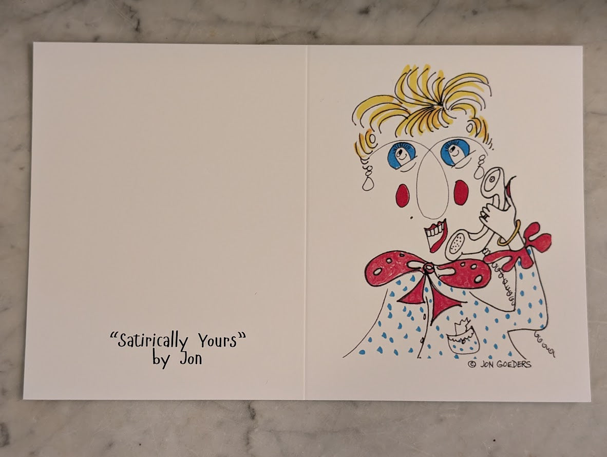 Printed on heavy weight Matte paper; the cartoon drawing on the front, a blank interior of the card allows for your personalized message, and the back of the card features the "Satirically Yours" by Jon logo. An envelope is also included.