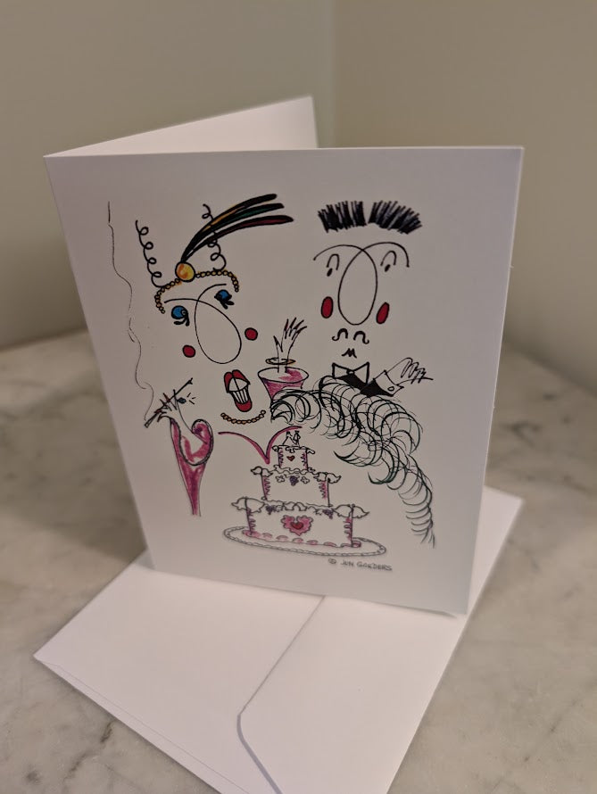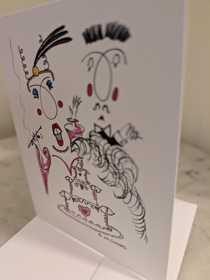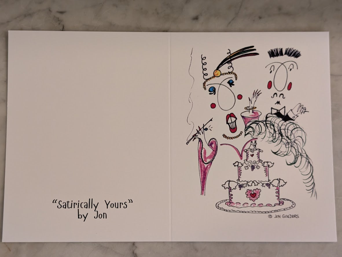 Printed on heavy weight Matte paper; the cartoon drawing on the front, a blank interior of the card allows for your personalized message, and the back of the card features the "Satirically Yours" by Jon logo. An envelope is also included.