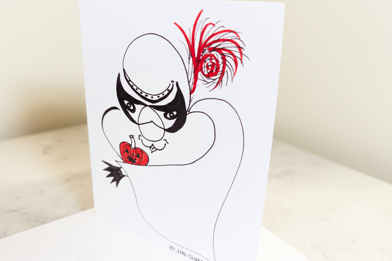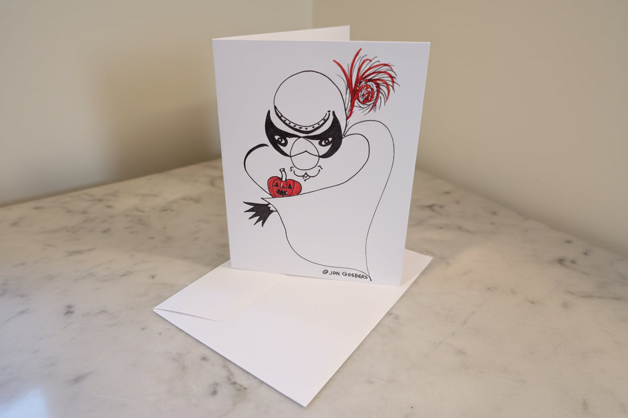This spooky-meets-silly greeting card is a Halloween must-have! A ghostly character draped in a flowing cape conceals a delightful surprise—under his cape he unveils a grinning jack-o-lantern tucked underneath. It's the ultimate trick-or-treat moment in card form, blending mysterious charm with laugh-out-loud reveals. Perfect for Halloween parties, costume celebrations, or sending seasonal cheer to anyone who appreciates a good magical reveal and playful pumpkin humor.