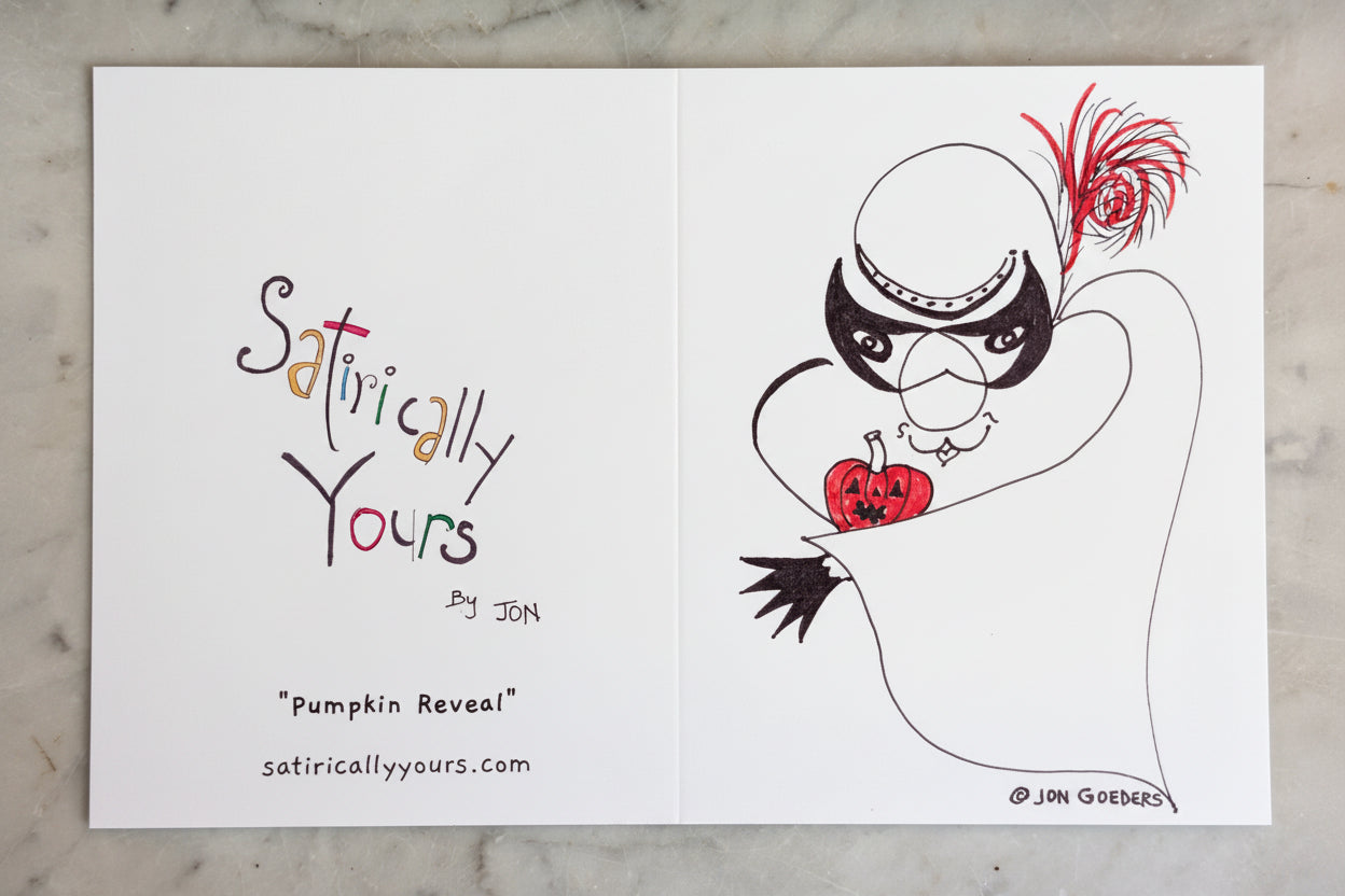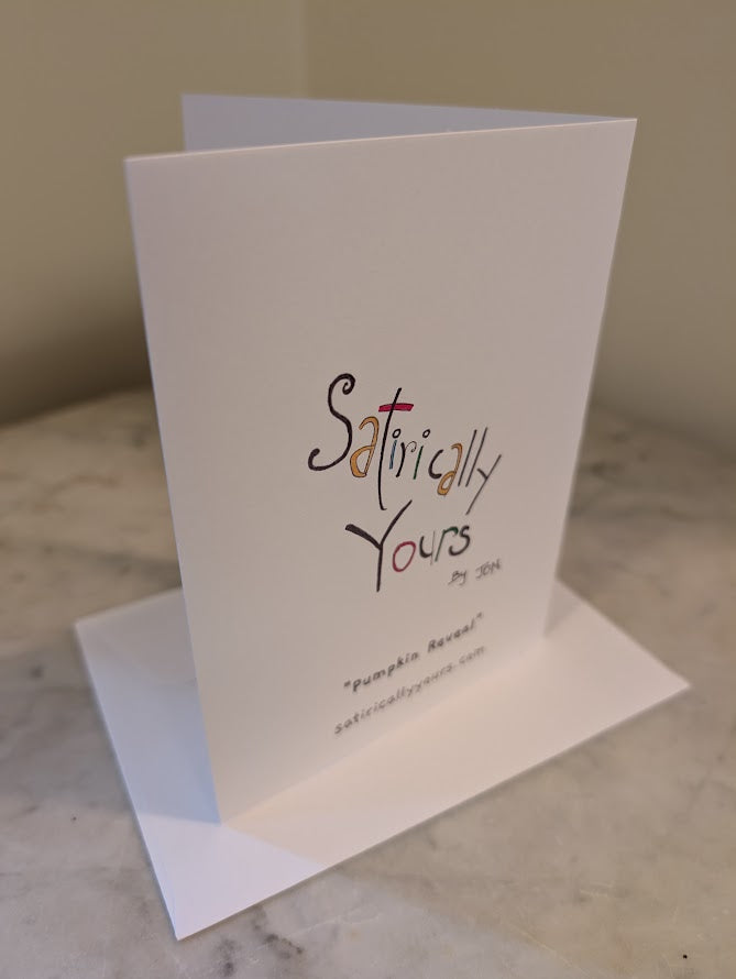 Printed on heavy weight Matte paper; the cartoon drawing on the front, a blank interior of the card allows for your personalized message, and the back of the card features the "Satirically Yours" by Jon logo. An envelope is also included.